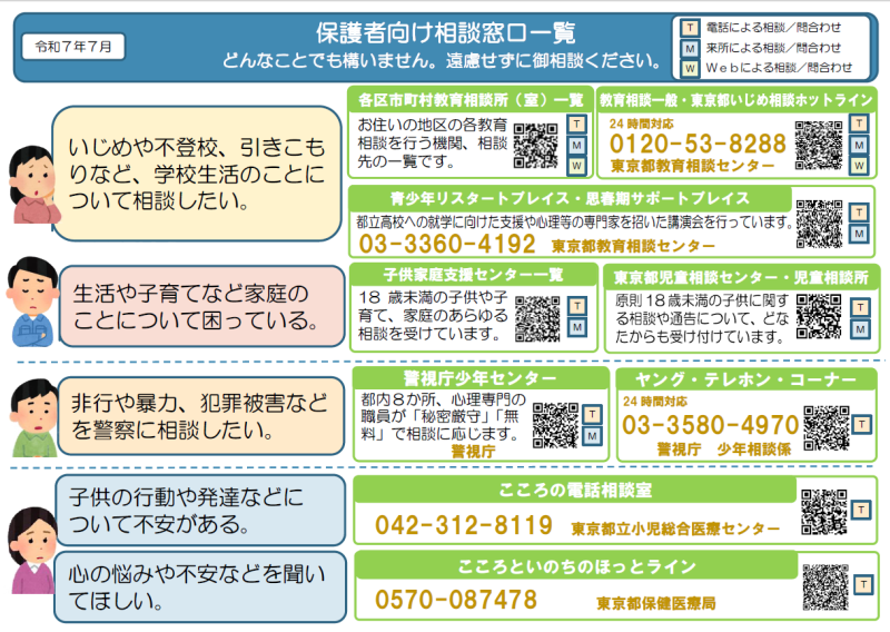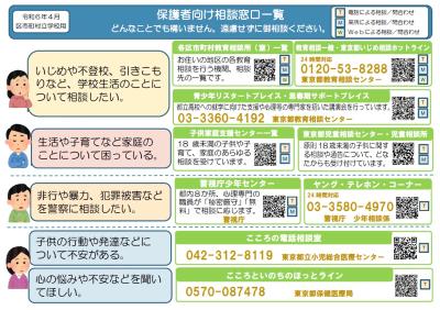 「保護者向け相談窓口一覧」を掲載しました。御一読いただければと思います。