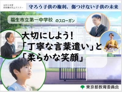 福生第一中学校では、すべての教員、講師、外部指導員が体罰のみならず、不適切な言動のいっさいの根絶と、子供の人権、人格、個性の尊重を誓います。そのため、今年度は以下のようなスローガンを掲げます。