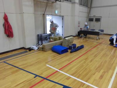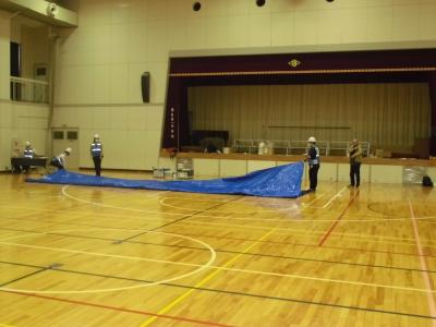 体育館にブルーシートを敷き、段ボールテントの設営を行いました。