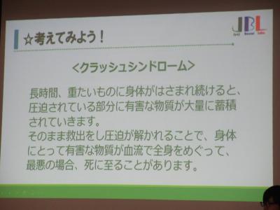 今回の条件では、クラッシュシンドロームが考えられるのです。そのことを知っている生徒もいました!「助けたいと思って取った行動が、命を奪う行動になってしまうかもしれない」正しい知識をもつことの重要性に改めて気付かされました。今回の講話を通して学んだこと、ぜひ周りの人へ広めてくれたらと思います。