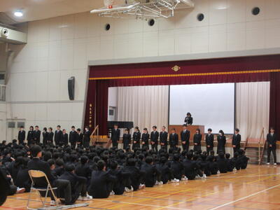 校長先生のお話では、「あいさつはすべての基本」「自分を磨こう」というお話がありました。「磨く」という言葉は今年生徒の皆さんに大切にしてほしい一中のキーワードです。ダイヤモンドは原石を磨くことで光り輝きます。私たち人間もまた同じです。自らのもつ才能を信じて自分を磨き続けていきましょう。