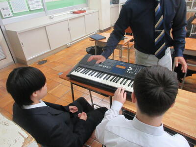 コードの基礎を習い、苦戦しながらも皆で演奏していました。集団で何かひとつの目標に向かうためには、高度なコミュニケーションが必要です。合唱コンクールしかり、音楽を介すことで、その壁を取り払うこともできるかもしれません。