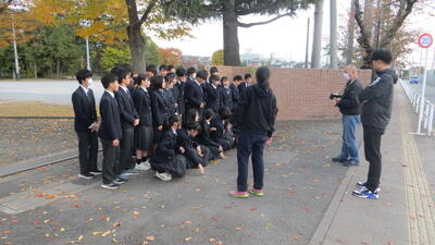 1組は外で撮りたい!という声が多かったようで、校門を背景に撮影していました。