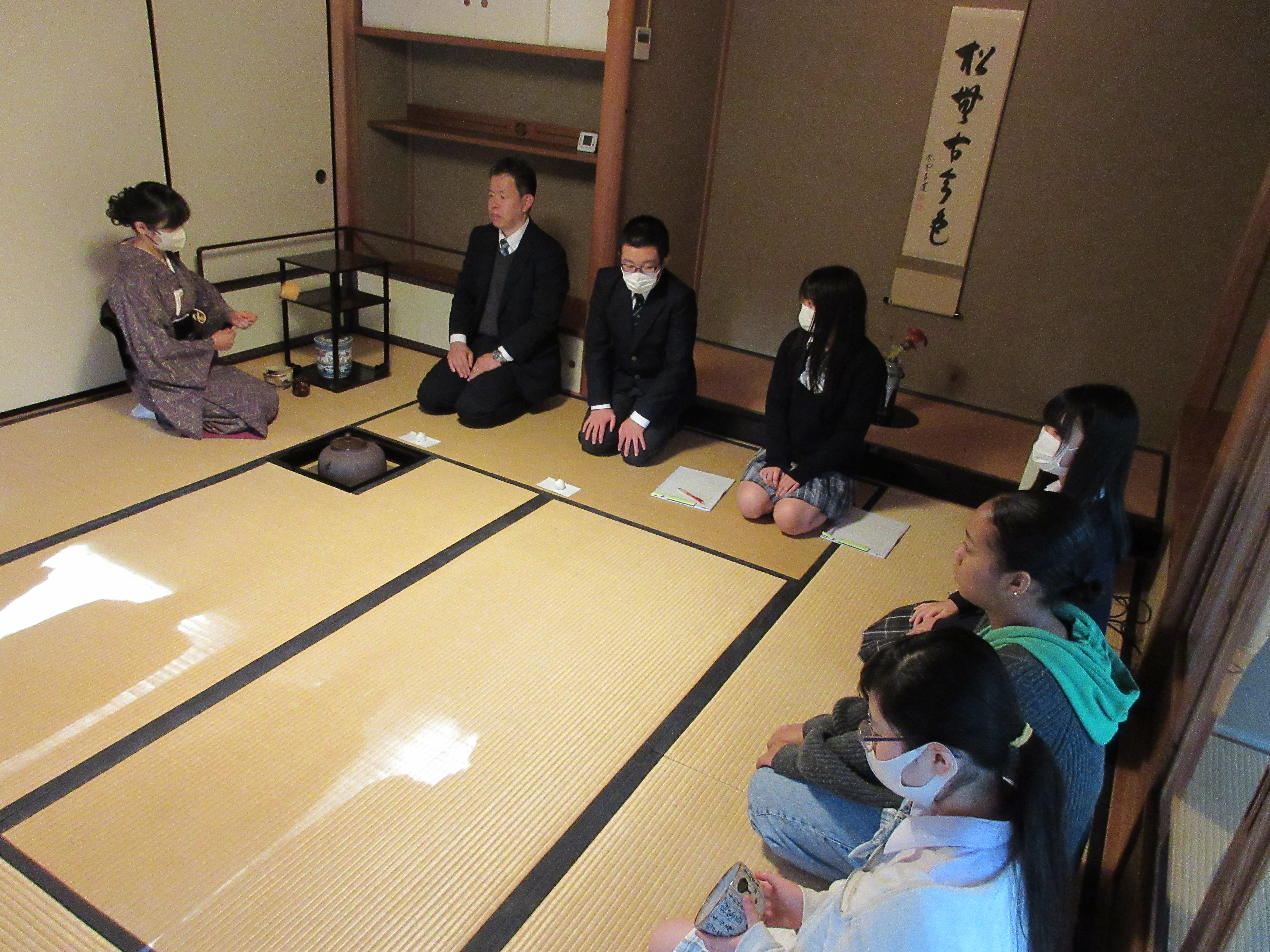 11月18日(木)に7組のプロジェクト学習として、福生市茶道連盟の皆様にご協力いただき「茶道体験」を行いました。事前に日本文化や茶道の歴史、礼儀やマナーなどを学び、福生市の茶室「福庵」でお茶を点てていただきました。
