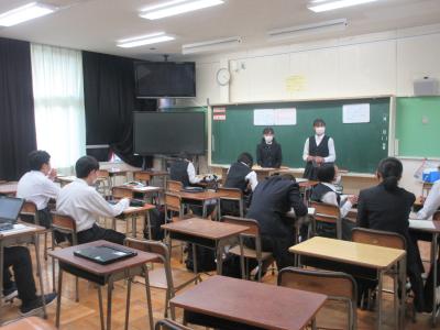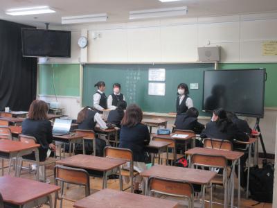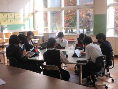 2年生徒は職場体験の事後学習を行いました。一人1台端末を活用し、プレゼンテーションソフトを活用して体験をまとめました。グループごとに役割分担し、相談しながら進めていました。